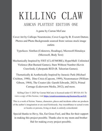 - Mostly complete, if untested, rules for play. Killing Claw features a simple d6 dice pooling system, customizable character classes, and simple (but deep) tactical combat that provides a structure for actions without being too granular or 'crunchy.' Currently, it lacks an outline for creating NPCs and tags for certain pieces of equipment, along with the more detailed version of the hexcrawl system. All of these features are still in development and will be included in the final playtest version once the core systems have been revised.