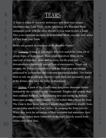 - Two complete Teams. The human (and android) Vultures scour the Zone for treasure and vital supplies to help beleaguered communities or for mere personal gain, while the legendary mutant dinosaurs of the Alphas seek to survive (or escape) the time-lost climes;